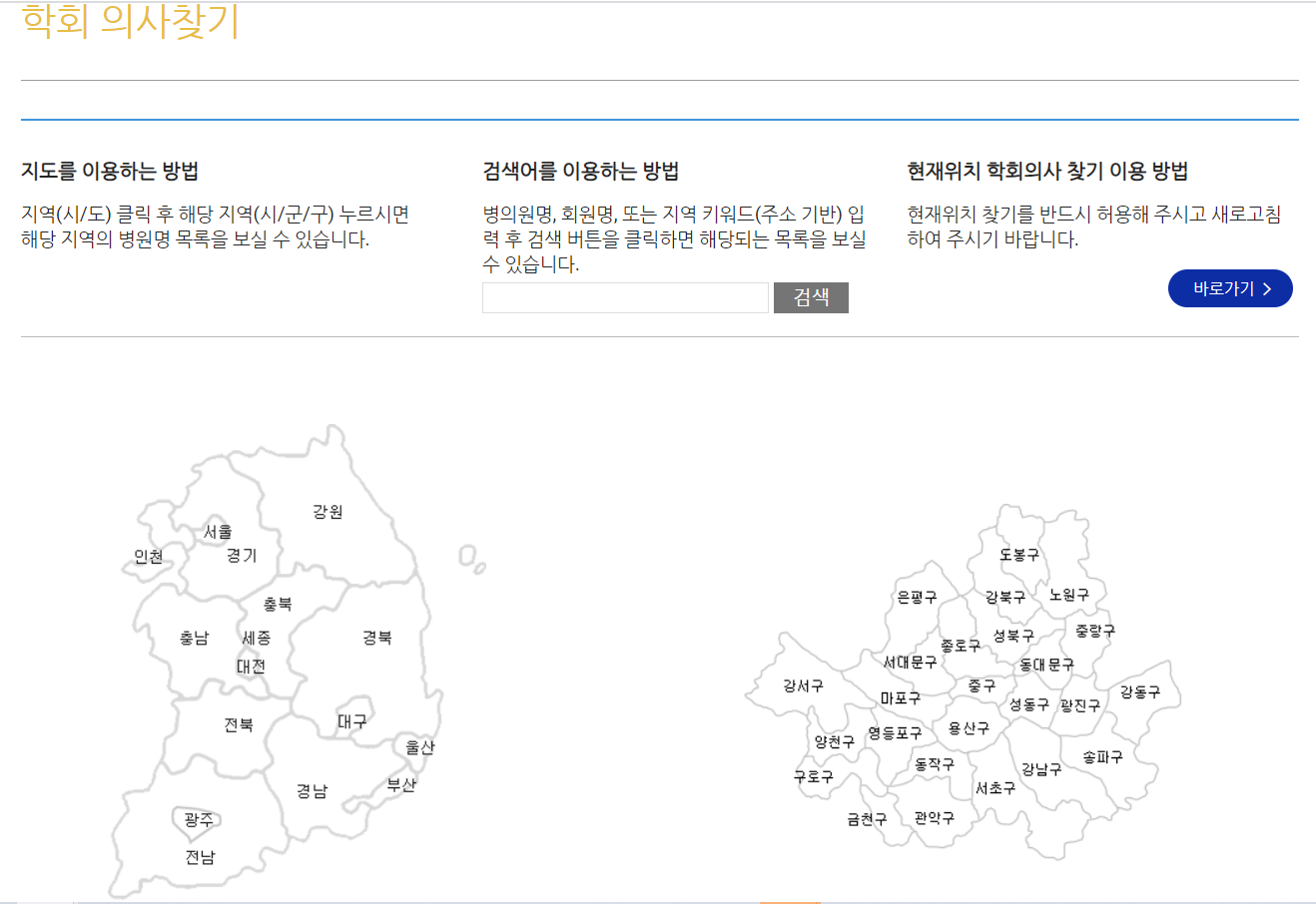 또는 대한치과교정학회 홈페이지에 들어가서 위 사진처럼 첫 화면의 '학회 의사찾기'를 클릭해서 들어가면 된다.