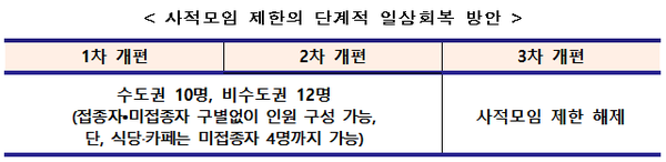: 접종여부에 상관없이(식당 등 제외) 수도권 10명까지 가능, 비수도권 12명까지 가능