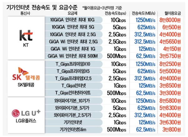 인터넷속도에 따라 요금제 가격도 다르다보니